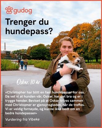 May 2025For en glede! Christopher hadde Caprio i tre netter, en 14 år gammel herremann. Måten Christopher oppdaterte meg, og vår kommunikasjon i forkant av oppholdet har gjort dette til en særdeles god opplevelse. Jeg kan varmt anbefale Christopher. Appen er også lett å bruke og rammevilkårene optimaliserer trygghet for eier, hund og passer. Jeg vil helt klart anbefale Gudog.